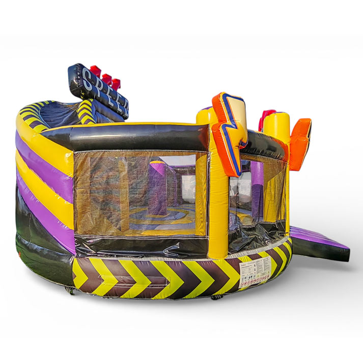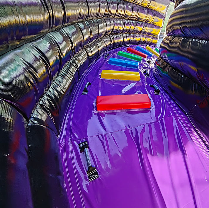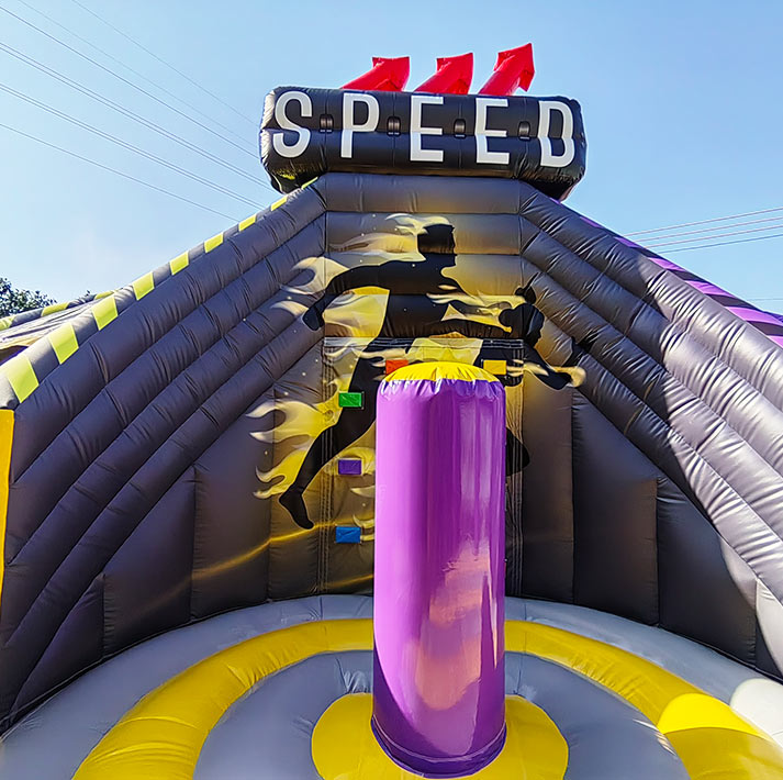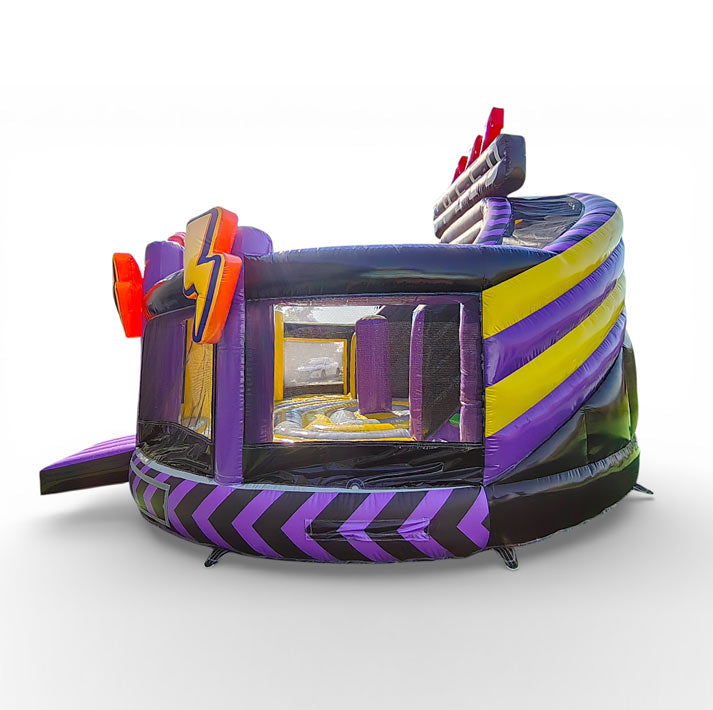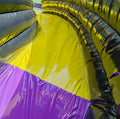 Ready for action! The Action-Power Maxi bouncy castle is the ultimate powerhouse for large events, youth events and rental professionals. This gigantic multiplay module in a dynamic black, yellow and purple design attracts everyone's attention and, with its 6.9 x 7.6 m footprint, offers enough space for up to 15 young athletes. Here you not only jump, but also slide quickly over the spectacular XL slide with a 2.7 m platform height!