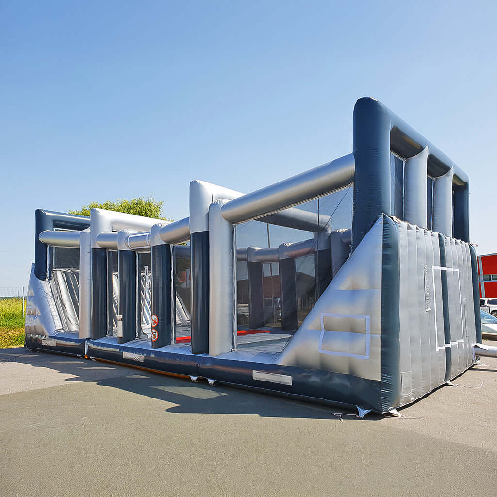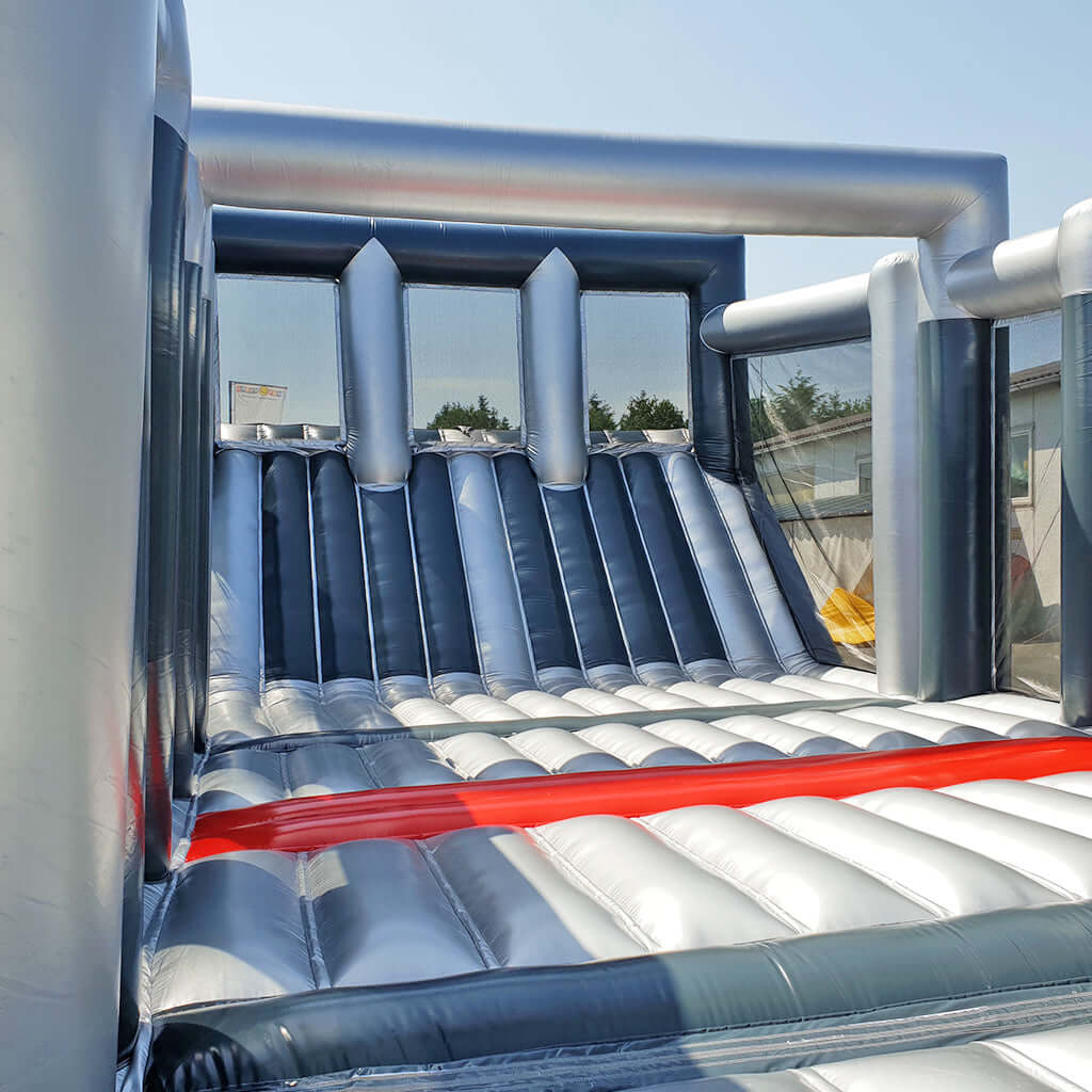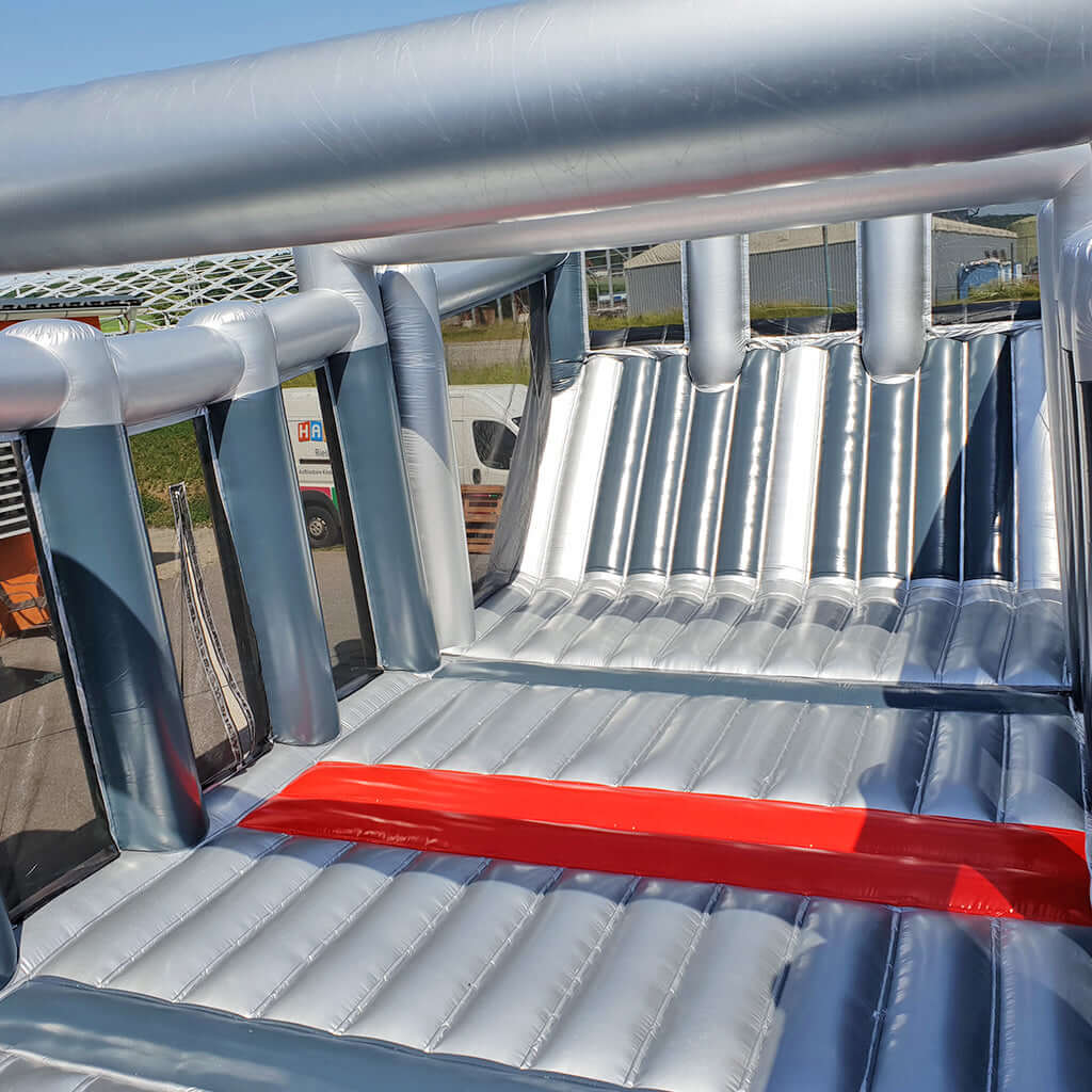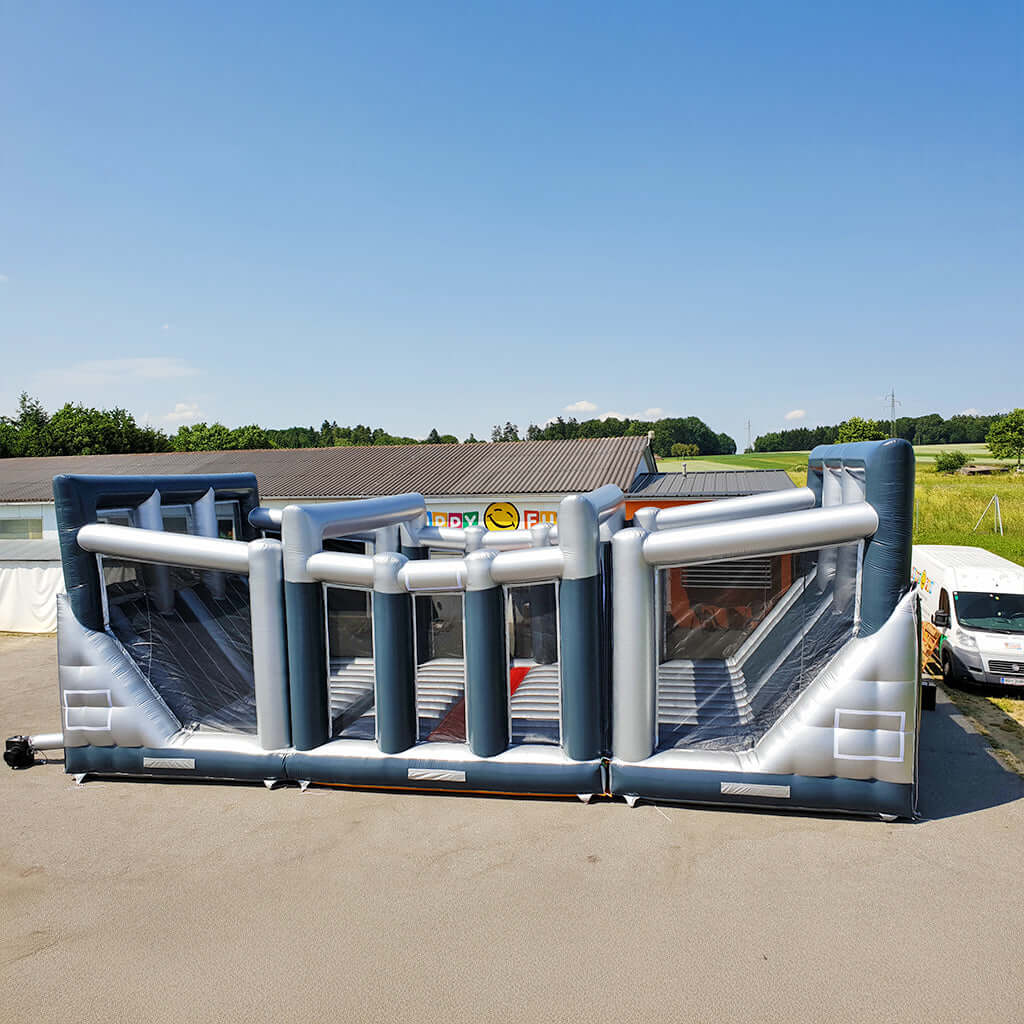 Die aufblasbare Dodgeball Arena bietet rasante Duelle, bei denen zwei Teams gegeneinander antreten und versuchen, sich mit geschickten Würfen gegenseitig aus dem Spiel zu nehmen. Stabile Seitenwände sorgen für klare Spielfeldgrenzen, das gepolsterte Design für maximale Sicherheit. Mit ihrer futuristischen Optik in Silber und Schwarz wird sie zum Blickfang auf jedem Event. Ob Sportfest, Firmenfeier oder Teambuilding – hier ist Action garantiert. Noch mehr sportliche Hüpfmodule für energiegeladene Events entdecken Sie hier in unserer Übersicht!