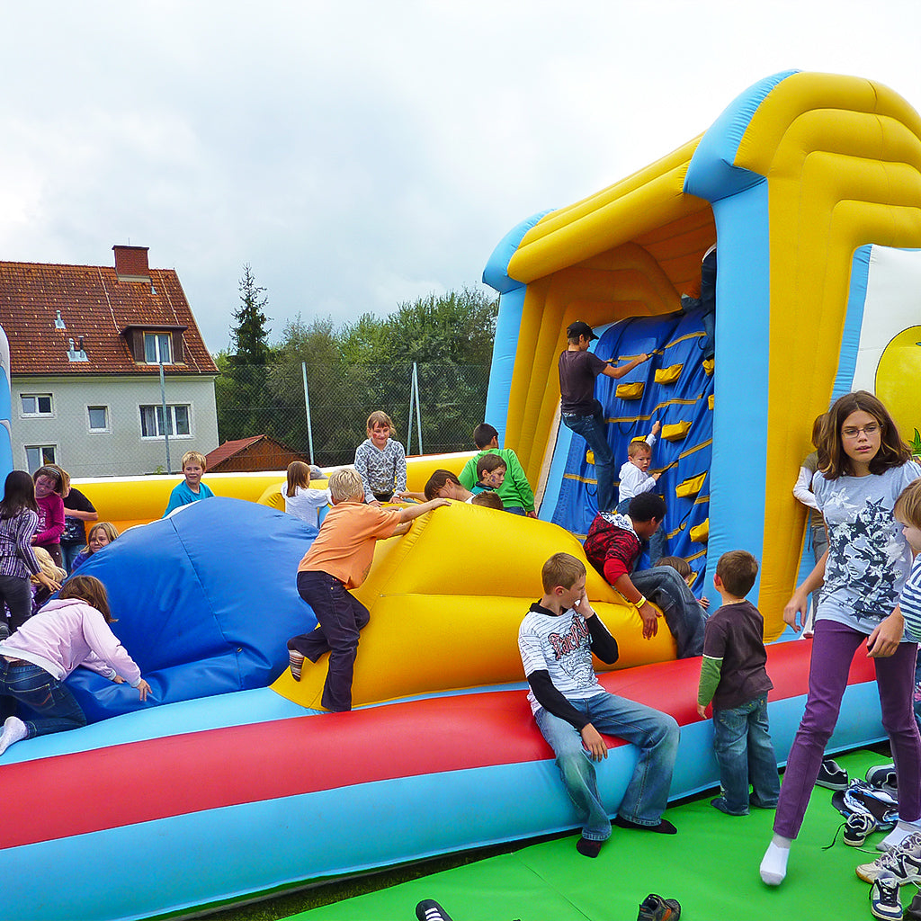Gefertigt aus hochwertigen, strapazierfähigen Materialien erfüllt die Hindernisbahn die EN 14960-Normen für aufblasbare Spielgeräte und gewährleistet so höchste Sicherheit und Langlebigkeit. Die lebhaften Farben und die detailreiche Gestaltung ziehen sofort die Aufmerksamkeit auf sich und machen die Bahn zu einem Highlight auf jedem Event. Egal ob für einen Freizeitpark, ein Sommerfest oder ein Firmenevent, diese Hindernisbahn verspricht unvergesslichen Spaß für alle Teilnehmer.