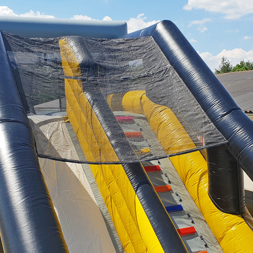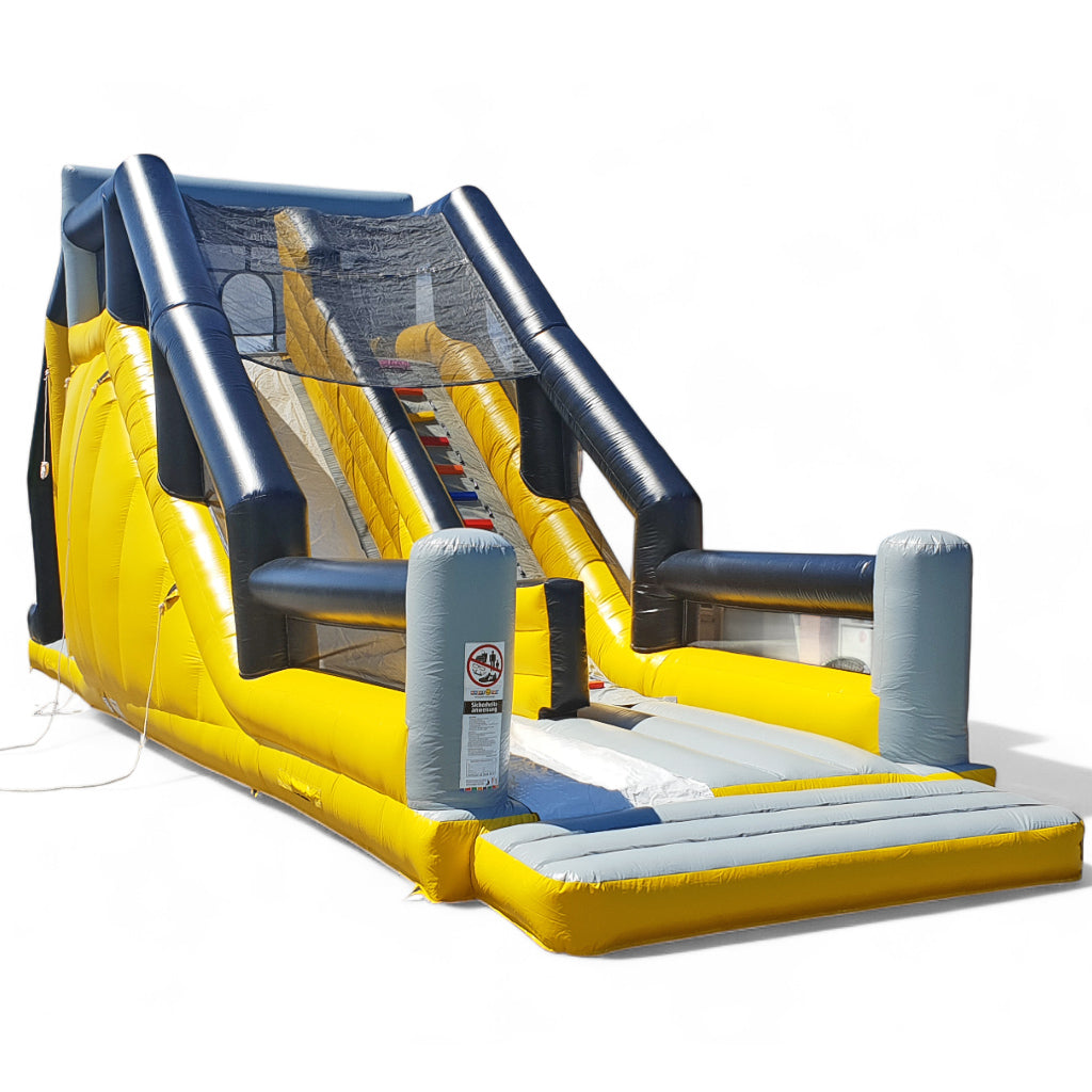 Diese eindrucksvolle, aufblasbare Attraktion kombiniert den Nervenkitzel eines Base-Jump-Erlebnisses mit einem sicheren, familienfreundlichen Design. Das Modul vereint mehrere Elemente in einem: Ein herausfordernder Aufstieg über eine Kletterwand, eine steile Rutsche für rasante Abfahrten und ein großzügiger Sprungbereich mit Fallschutz, der den Teilnehmenden das Gefühl eines freien Falls vermittelt, dabei jedoch vollkommen sicher bleibt. Dank der gepolsterten Landezone können selbst spektakuläre Sprünge weich und sicher abgefangen werden.