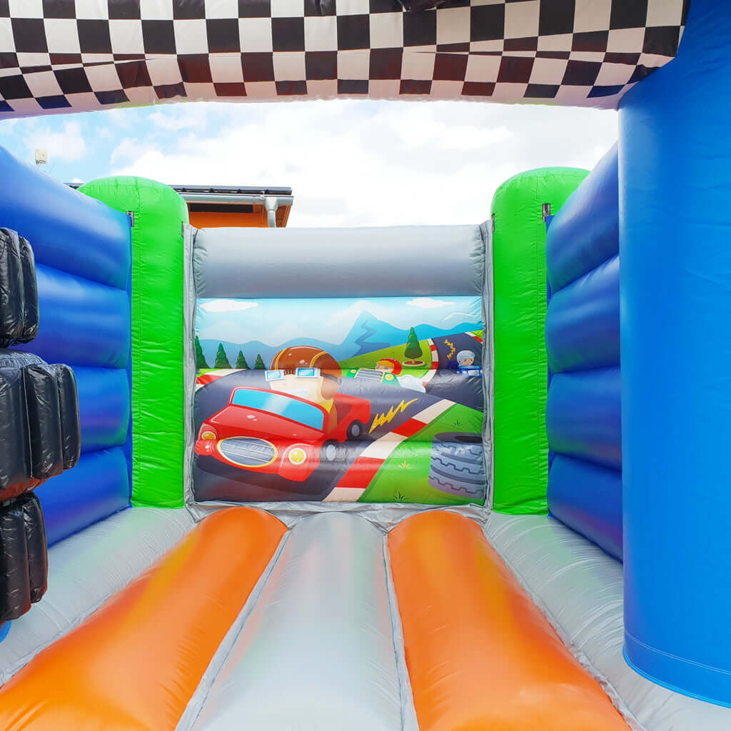 Hüpfburg mit coolem Auto und buntem Rennstrecken-Look