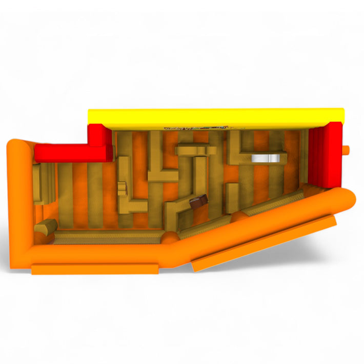 Diese Hüpfburg im Labyrinth-Design bietet mit bunten Hindernissen und verwinkelten Wegen ein interaktives Abenteuer für Kinder. Die warme Farbgebung in Gelb, Rot und Orange sorgt für auffällige Optik, das offene Layout ermöglicht gute Sichtbarkeit – ein typisches Produkt aus unserer Hüpfburglinie für personalisierte Anfertigungen. Hochwertig gefertigt, stabil konstruiert und nach EN 14960 zertifiziert, ist sie ideal für Events mit Erlebnischarakter.