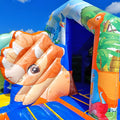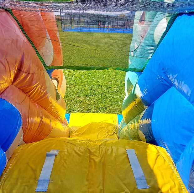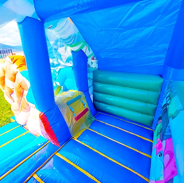 Diese farbenfrohe Hüpfburg mit Dinosaurier-Motiv begeistert Kinder mit ihrem liebevoll gestalteten Design rund um Triceratops, T-Rex & Co. Der hohe Rutschenturm in leuchtendem Blau und Orange sorgt für zusätzlichen Spielspaß und lässt Dino-Fans in ihre eigene Urzeitwelt eintauchen. Hergestellt aus hochwertigem, beidseitig PVC-beschichtetem Gewebe mit 650 g/m² ist die Hüpfburg besonders robust, UV-beständig und schwer entflammbar (B1). Verstärkte Nähte, stabile Seitenwände und die weiche Rutschfläche bieten maximale Sicherheit – auch bei wildem Toben.