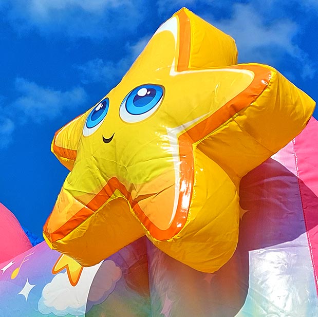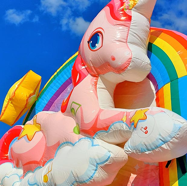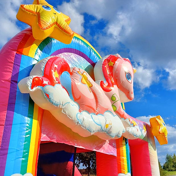 Mit dieser traumhaften Einhorn-Hüpfburg mit XL-Rutsche zieht Magie auf Ihrem Event ein! Bunte Regenbögen, funkelnde Sterne und das niedliche Einhornmotiv machen diese Hüpfburg zu einem absoluten Hingucker für Kinder. Die extragroße Rutsche sorgt für zusätzlichen Spielspaß – perfekt für energiegeladene Stunden voller Bewegung und Lachen.