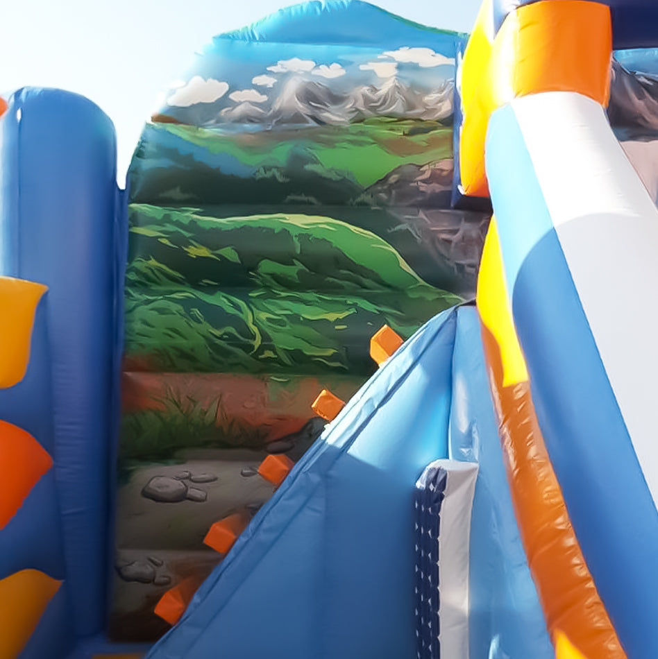 Diese Windrad Hüpfburg mit Rutsche beeindruckt durch ihr markantes Windkraftwerk-Design samt Propeller und Bögen. Die kräftigen Blau-Orange-Töne schaffen eine auffällige Optik – ideal für Promotions oder Großevents. Das hochwertige PVC garantiert Langlebigkeit und die EN 14960 garantiert Sicherheit. Eine Hüpfburg, die spielerischen Klimabezug mit Eventwirkung verbindet – eine Form, die sich häufig in unseren Kundenanfertigungen für Hüpfburgen zeigt.