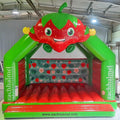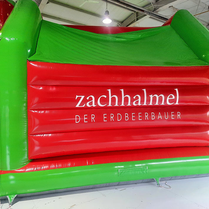 Diese individuell gestaltete Hüpfburg im Erdbeer-Design ist ein echter Blickfang und ideal für Promotionszwecke. Die kräftigen Rot- und Grüntöne, kombiniert mit einer süßen, übergroßen Erdbeer-Figur am Eingang, machen sie besonders attraktiv für Kinder – ein Konzept, das in unserer Abteilung Hüpfburgen im Wunschdesign entstanden ist. Perfekt für Märkte, Bauernhöfe oder Werbeveranstaltungen, sorgt sie mit gebrandeten Seitenteilen und hochwertigem Druck für maximale Markenpräsenz.