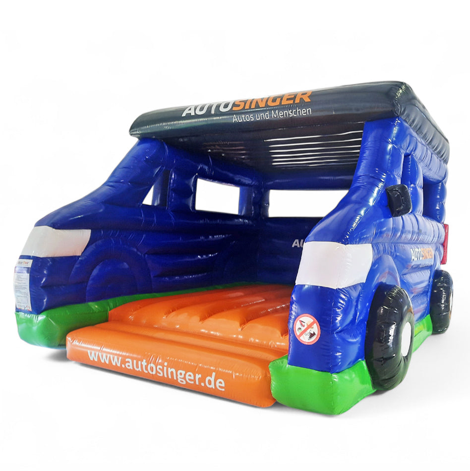 Diese individuell gefertigte Hüpfburg in Fahrzeugform mit Dach überzeugt durch markantes Design und detailreiche Elemente wie Reifen und Scheinwerfer. Der großzügige Hüpfbereich mit breiter Einstiegstufe lädt zum sicheren Toben ein – ein typisches Produkt aus unserer Hüpfburglinie für personalisierte Anfertigungen. Strapazierfähiges PVC garantiert langlebigen Einsatz. Ideal für Promotions rund um Mobilität und Markenpräsenz.