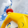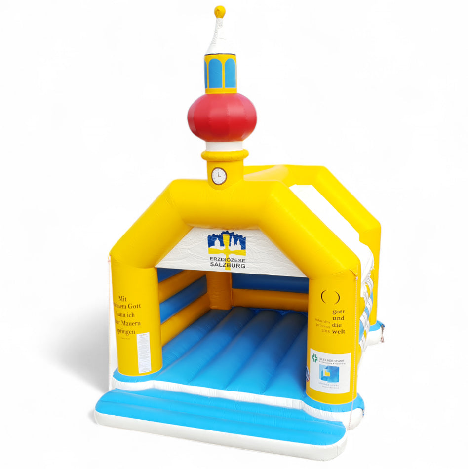 Diese individuell gefertigte Hüpfburg im Kirchen-Design überzeugt mit markanten Farben, hoher Turmspitze und detailreicher Gestaltung. Die großzügige Sprungfläche und stabilen Seitenwände ermöglichen ein sicheres Spielerlebnis – eine Umsetzung, wie sie in unserer Sonderanfertigungsabteilung für Hüpfburgen oft gefragt ist. Gefertigt aus strapazierfähigem, wetterfestem Material, eignet sie sich ideal für Gemeindefeste, thematische Events oder Promotions – auffällig, funktional und vielseitig einsetzbar.