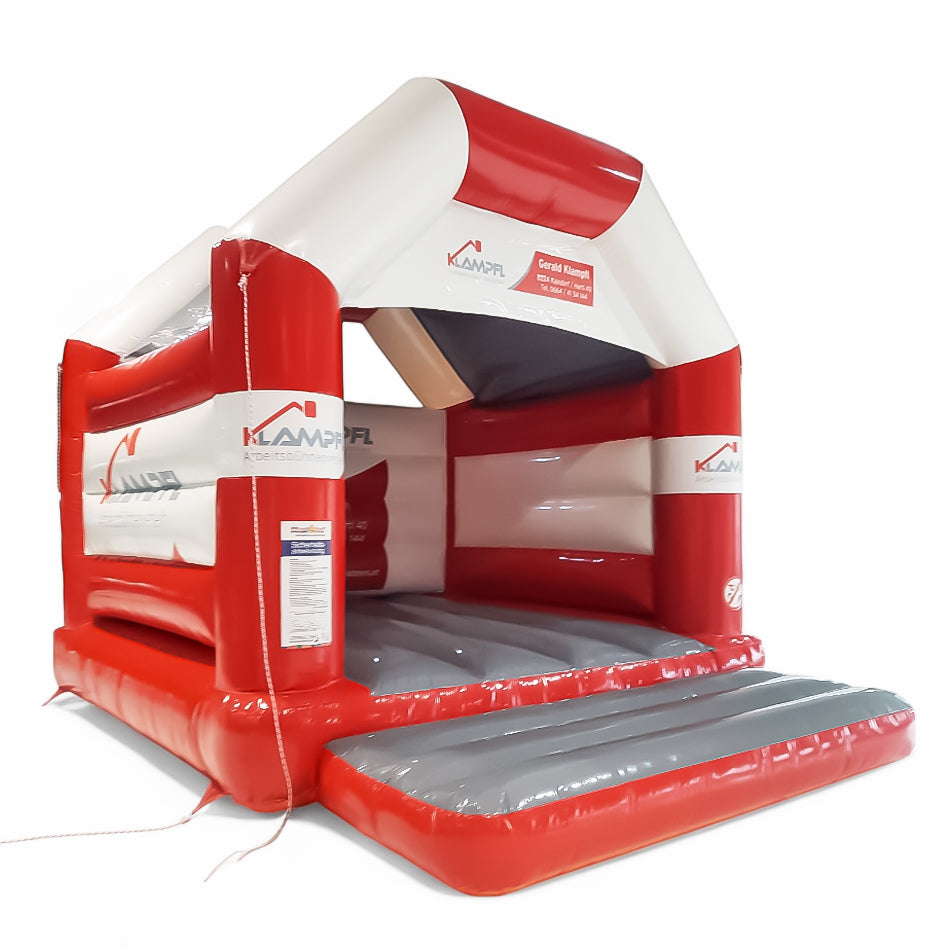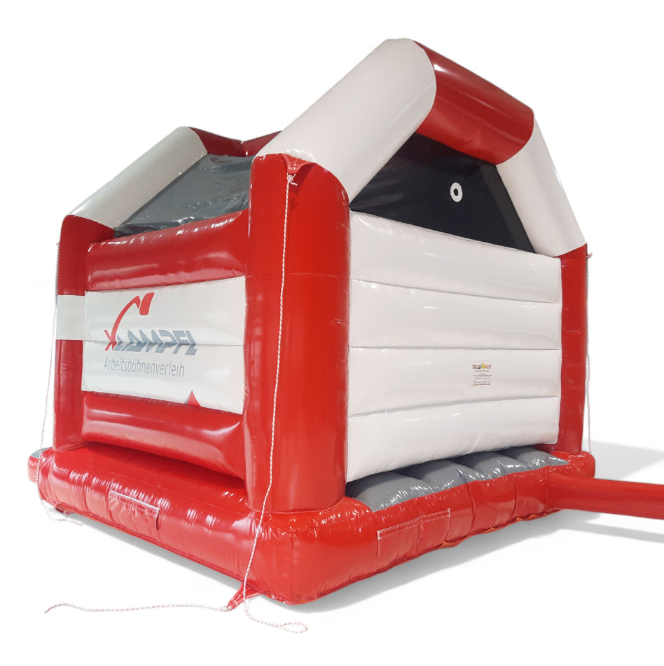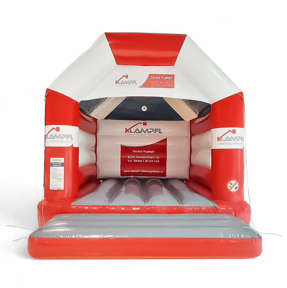 Diese kompakte Hüpfburg im Hausdesign wurde individuell gefertigt und überzeugt mit moderner Optik in Rot, Weiß und Grau. Sie bietet eine großzügige Sprungfläche, stabile Seitenwände und ein schützendes Dach – eine Umsetzung, wie viele andere Anfertigungen, die wir als personalisierte Hüpfburgen umgesetzt haben. Das robuste, wetterfeste Material macht sie ideal für Messen, Firmenveranstaltungen oder Kinderfeste. Auffällig, funktional und einfach im Aufbau.