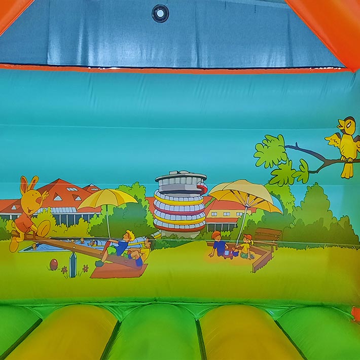 Diese farbenfrohe Hüpfburg, entworfen für die Sonnentherme, präsentiert sich mit fröhlichen Maskottchen und einer lebendigen Rutsche. Ähnlich wie weitere Modelle aus unserer Kategorie individueller Hüpfburgen-Designs überzeugt sie mit leuchtenden Farben und einem freundlichen Design, das Kinder einlädt, in einer sicheren und unterhaltsamen Umgebung zu spielen. Die Hüpfburg trägt das Logo der Sonnentherme, was die Bindung zur Marke stärkt und sie ideal für Veranstaltungen macht, die die Sonnentherme bewerben. Ein großartiger Weg, um jungen Gästen Freude zu bereiten und gleichzeitig die Bekanntheit der Therme zu erhöhen.