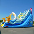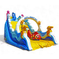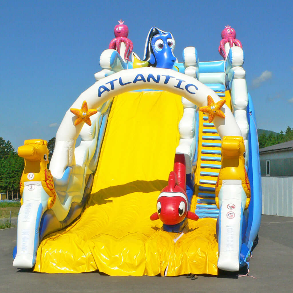 Die Riesenrutsche Atlantik bringt mit Seepferdchen, Sternfischen und bunten Farbverläufen echtes Meeresfeeling auf jedes Event – ideal für Sommerfeste, Freizeitparks oder maritime Themenpartys. Die breite Rutschfläche und der hohe Aufstieg sind sicher eingefasst und komplett austauschbar, was die Wartung erleichtert und die Lebensdauer deutlich erhöht. Visueller Highlight mit professioneller Technik vereint, findet in diesem Modell eine überzeugende Lösung. Gefertigt aus 900 g/m² starkem PVC, speichelecht und schwer entflammbar gemäß EN 14960, bietet die Atlantik-Rutsche sichere und langlebige Spielfreude.