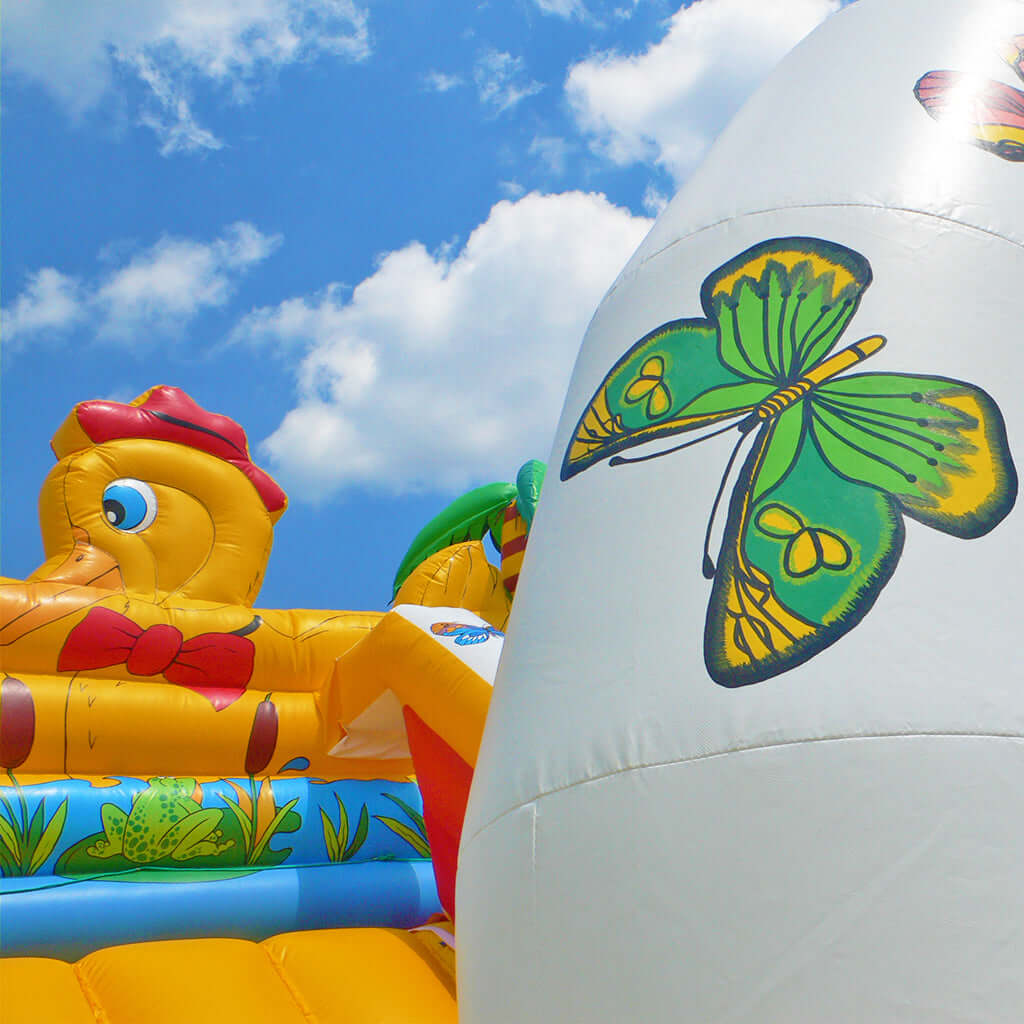 Die Hüpfburg Riesenrutsche Ente überzeugt mit extrabreiter Rutschfläche, stabilem Aufstieg und hoher Seitenführung – ideal für sichere Einsätze bei Events. Das detailreiche Entenmotiv mit Naturillustrationen schafft eine fröhliche Szenerie, die Kinder sofort anspricht. Wer ähnliche aufblasbare Riesenrutschen kaufen möchte, die kindgerecht gestaltet und technisch durchdacht sind, findet in unserem Sortiment weitere passende Modelle. Sowohl Aufstieg als auch Rutschbahn sind modular austauschbar. Gefertigt aus 900 g/m² PVC, erfüllt das Material alle EN 14960-Anforderungen.