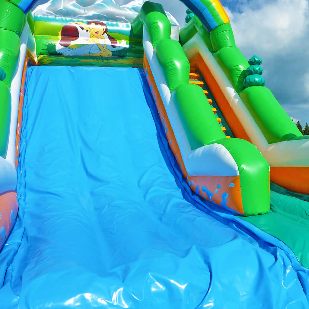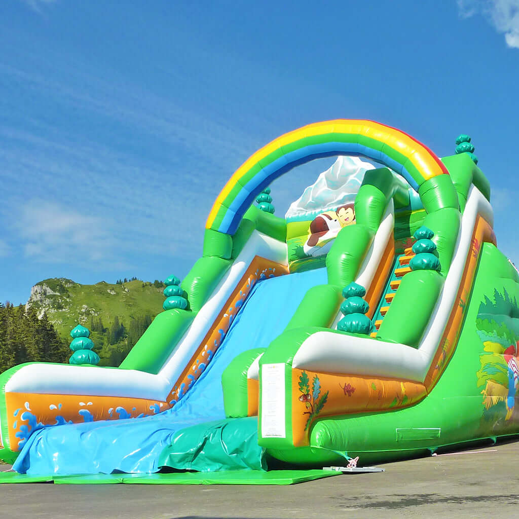 Die Riesenrutsche Heidi bringt mit Bergkulisse, Blumenwiese und Regenbogenbogen alpinen Charme auf jedes Fest – perfekt inszeniert für Schulfeiern, Themenfeste oder Outdoor-Events. Die große Rutschfläche in Blau sowie der hochgelegene Aufstieg sind rundum eingefasst und vollständig austauschbar – ein klares Plus in Sachen Wartung und Lebensdauer. Wer hochwertige Riesenrutschen kaufen möchte, die kindgerechtes Design mit professioneller Verarbeitung verbinden, findet hier eine ideale Lösung. Hergestellt aus 900 g/m² starkem, speichelechtem und schwer entflammbarem PVC gemäß EN 14960, überzeugt dieses Modell durch maximale Belastbarkeit und Sicherheitsstandard.