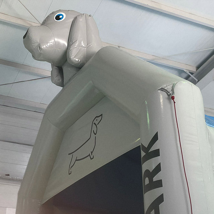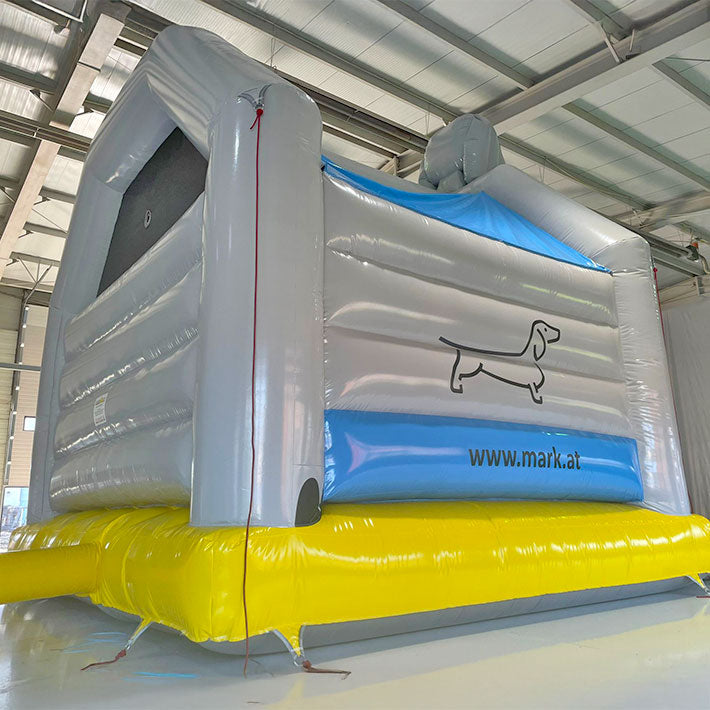 Für einen Kunden haben wir eine individuelle Hüpfburg angefertigt. Da der Dackel das Maskottchen des Unternehmens ist, wurde eine Hüpfburg in Form eines Dackels entworfen – eine Lösung, die ähnlich umgesetzt wurde wie viele Designs in unserer Rubrik „Hüpfburg mit Branding“. Die Logos wurden auf den Säulen platziert und im Eingangsbereich ist die Website ersichtlich. Auch Lust auf eine eigene Werbehüpfburg? Jetzt anfragen!