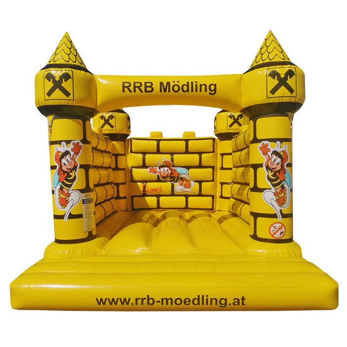 Diese Sonderanfertigung einer Hüpfburg für die Raiffeisenbank Mödling präsentiert sich in leuchtendem Gelb mit charakteristischen Türmen, die an eine Burg erinnern. Auf der Hüpfburg sind spielerische Abbildungen von Sumsi, dem Maskottchen der Bank, zu sehen – ergänzt wird dieses Konzept durch viele weitere gebrandete Hüpfburgen im Custom-Bereich. Durch die prominente Platzierung des Firmenlogos und der Website wird nicht nur eine fröhliche Spielumgebung geschaffen, sondern auch die Markenpräsenz effektiv verstärkt. Dieses Design eignet sich hervorragend für Veranstaltungen und Promotions, um die Marke spielerisch und einprägsam zu präsentieren.