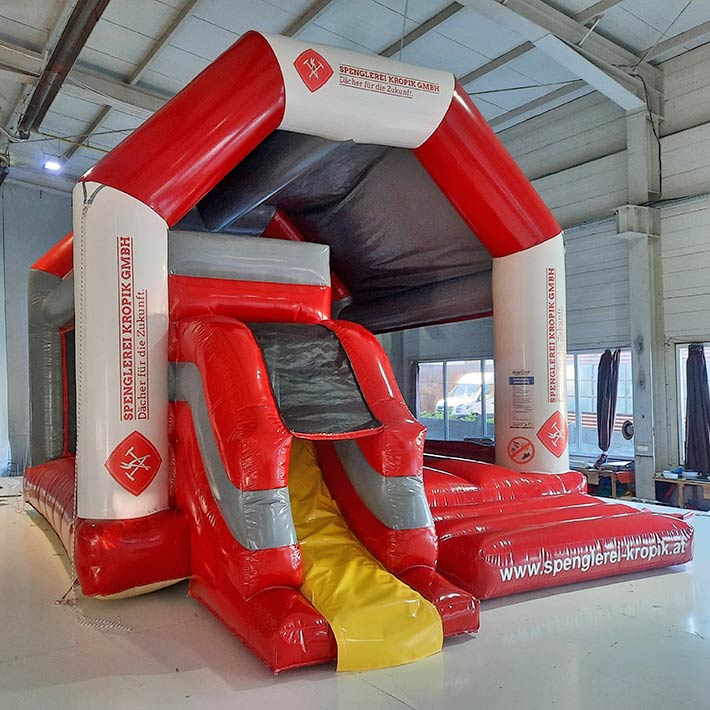 Für die Spenglerei Kropik haben wir eine individuelle Hüpfburg mit Rutsche gefertigt, die ideal für Werbezwecke und Veranstaltungen geeignet ist. Dieses Modell überzeugt durch ein auffälliges Design in Firmenfarben und sorgt für sichtbare Präsenz.