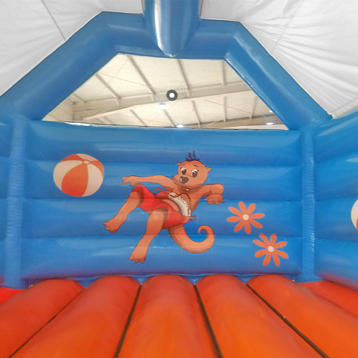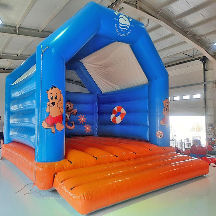 Diese individuell gestaltete Hüpfburg wurde speziell für die Therme Stegersbach entworfen und präsentiert das sympathische Maskottchen Badolin. Die Farben Blau und Orange spiegeln die erfrischende Atmosphäre der Therme wider und sorgen für einen hohen Wiedererkennungswert – ergänzt unser Sortiment rund um gebrandete Hüpfburglösungen. Perfekt für Events & Familienattraktionen. Die hochwertige Verarbeitung garantiert eine sichere Nutzung im Innen- und Außenbereich. Durch den auffälligen Werbeaufdruck mit Logo und Maskottchen wird die Marke optimal in Szene gesetzt und bleibt nachhaltig im Gedächtnis der Besucher.