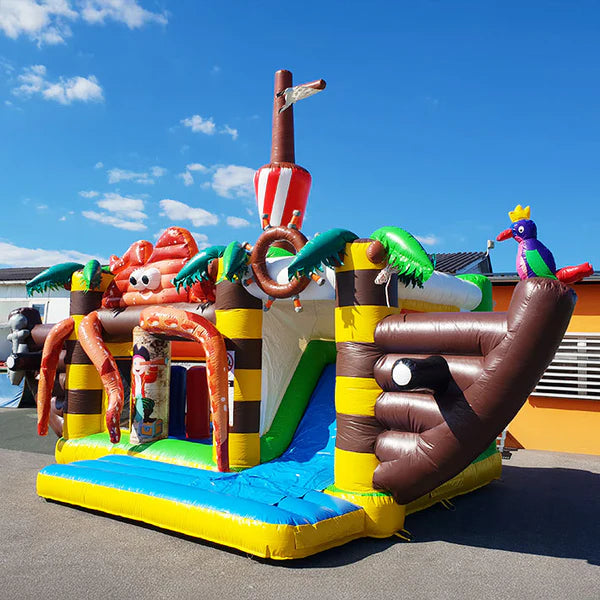 Mieten Sie unsere coole Pirat Hüpfburg für Ihre nächste Piratenparty! Diese farbenfrohe Hüpfburg mit liebevollen Details wie Palmen, Kanonen, einem Kraken, einem Papagei und einem großen Oktopus am Eingang verwandelt jeden Garten in die perfekte Kulisse für kleine Abenteurer. Die Pirat Hüpfburg hat eine Gesamtlänge von 8,6 m und eine Tiefe von 5,3 m. Im Inneren warten spannende Hindernisse sowie eine Rutsche auf die Kinder.