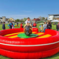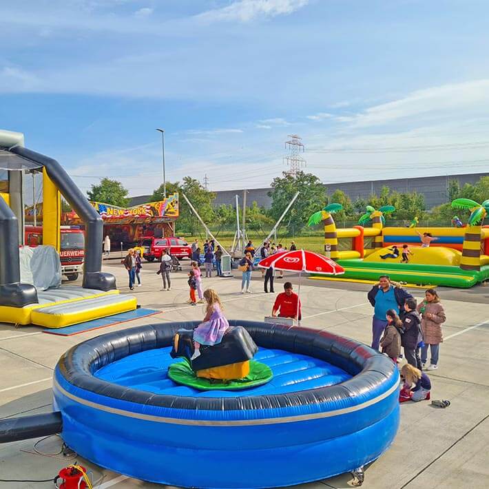 Der Rodeo Bulle als Rundanlage kombiniert bewährte Mechanik mit kompaktem Aufbau – perfekt für flexible Einsätze bei Stadtfesten, Messen oder Firmenevents. Das gepolsterte Rundkissen mit auffälliger Signaloptik garantiert Sicherheit bei jeder Landung, während der Joystick-gesteuerte Bulle mit Zeitmessung und fünf Programmen für Wettkampfspaß sorgt. Wer neben dem klassischen Bullen auch Surfbrett, Rentier oder Spezialaufsätze einsetzen möchte, findet im modularen Happy-Fun-System vielseitige Möglichkeiten für individuelle Eventgestaltung. Auf Wunsch ist auch das Branding des Kissens frei wählbar.