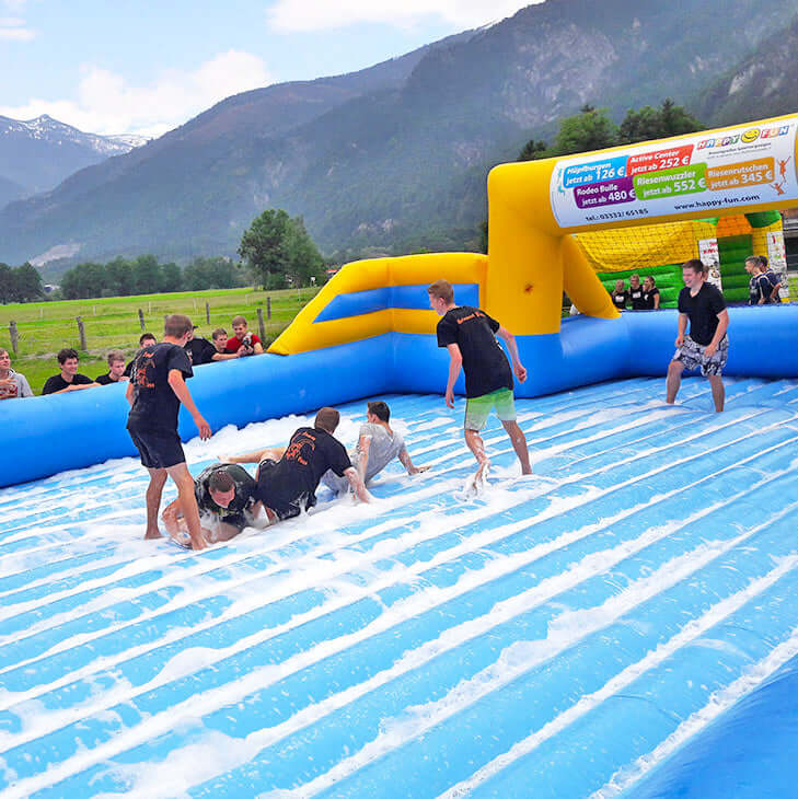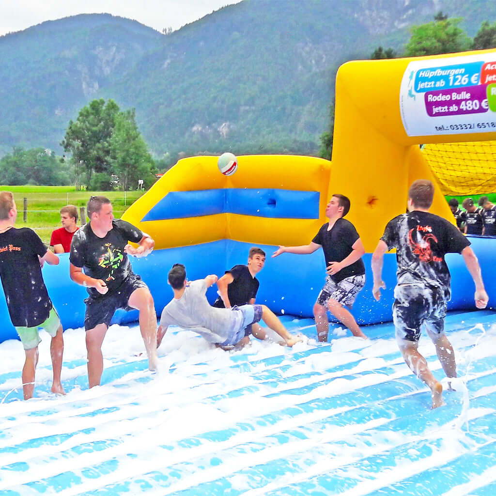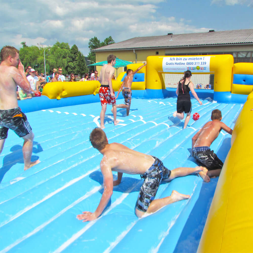 Das Water-Soccer, auch Soap Soccer und Seifenfußball genannt mit aufblasbarem Boden, kombiniert den Spaß von Fußball und Wassersport in einem. Die durchgehende, weiche Spielfläche bietet optimale Dämpfung und sorgt für maximale Sicherheit – perfekt für Barfußspieler oder in Badeschuhen. Hier können Kinder, Jugendliche und Erwachsene nach Herzenslust toben, kicken und sich richtig auspowern.