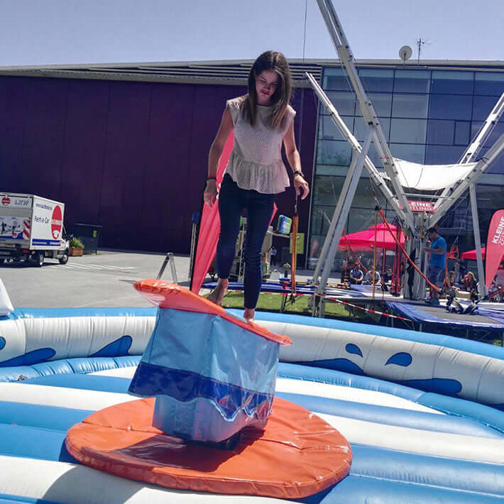 Der Surf Simulator in runder Komplettausführung bringt dynamisches Beach-Feeling aufs Eventgelände: Auf dem beweglichen Surfbrett testen Teilnehmende ihr Gleichgewicht, während das rund gepolsterte Luftkissen Sicherheit bei jedem Sturz garantiert. Die Steuerung läuft über ein zentrales Pult mit fünf Automatikprogrammen plus Joystick – ideal für Wettbewerbe mit Zeitmessung. Für alle, die noch mehr sportliche Eventmodule mit Branding-Möglichkeiten suchen, bietet unser Rodeo-Bereich weitere Highlights für starke Markenauftritte. Optisch überzeugt das System durch tropisches Design und hohe Fernwirkung.