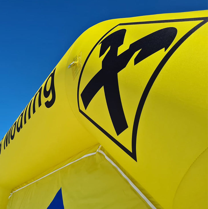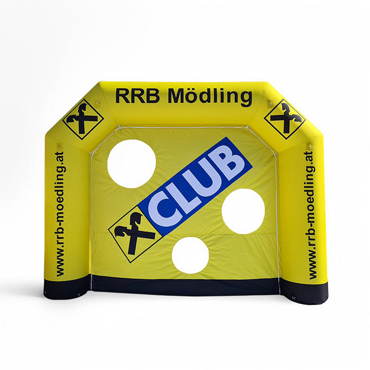 Zwei Funktionen, ein starkes Produkt: Diese aufblasbare Torschusswand verwandelt sich mit wenigen Handgriffen in einen vollwertigen Werbetorbogen.